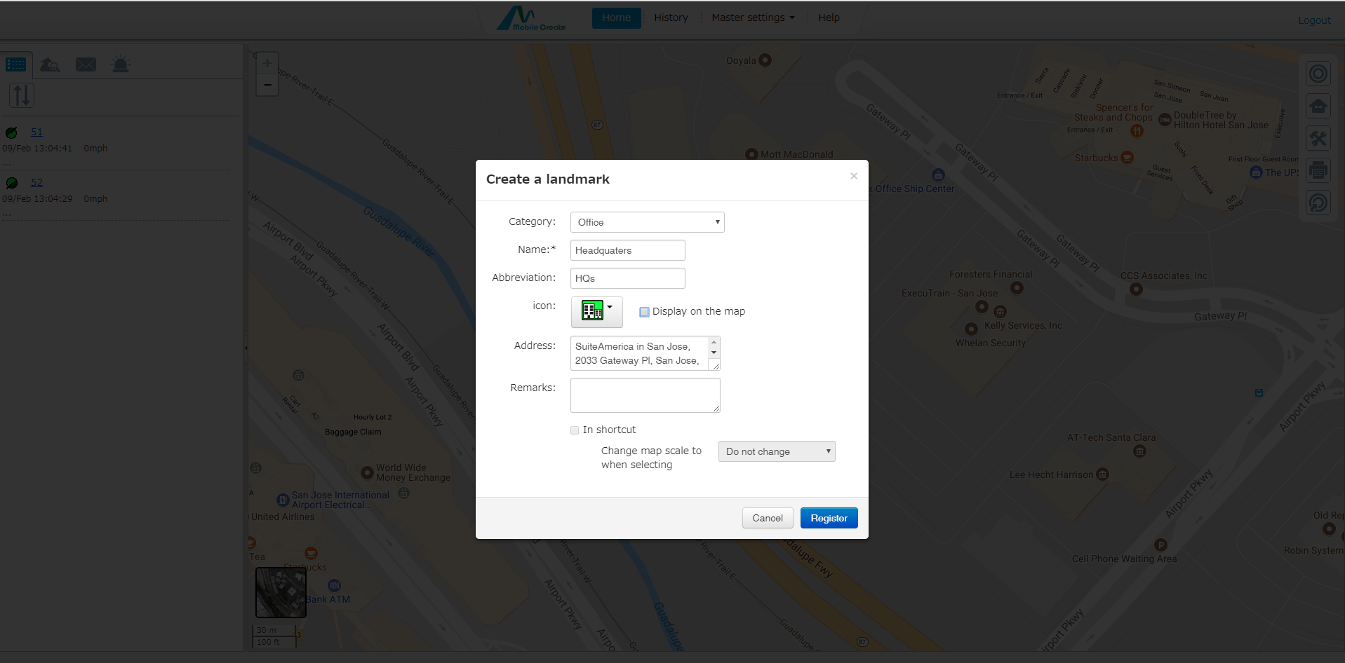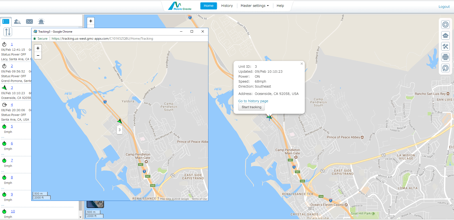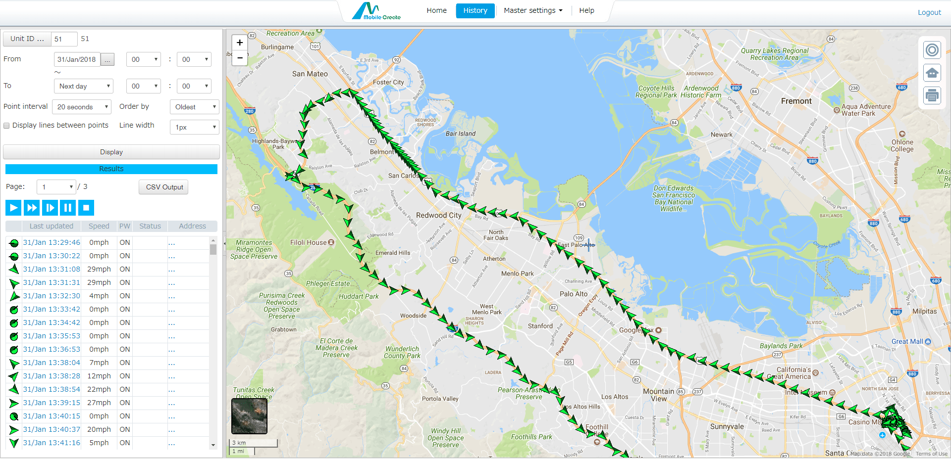 The tracking plots are displayed in selectable intervals such as all plots, 10 seconds, 1 min, 3 mins and so on. The history can be useful for selecting driving routes and proof of delivery to customers. Also, by watching the speed of vehicles, you can give safety guidance to drivers and ensure reliability to clients.